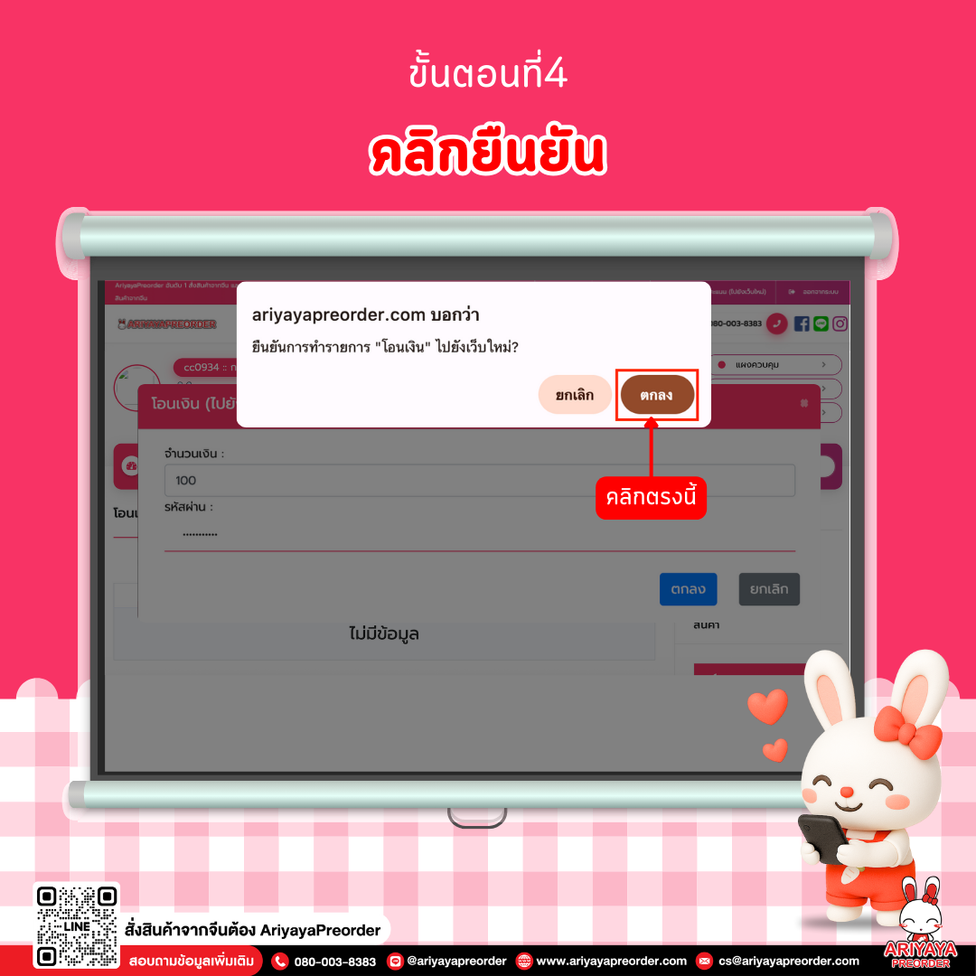 ขั้นตอนที่ 3 - ใส่ยอดเงินที่ต้องการโอนและกรอกรหัสผ่านเข้าระบบ และคลิก “ตกลง”